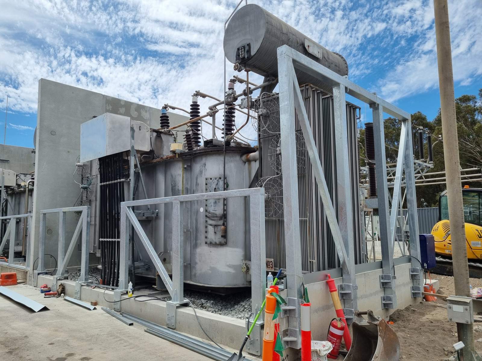 - Hot-dip galvanised finish — specified for durability in the exposed substation environment, consistent with the earlier installation